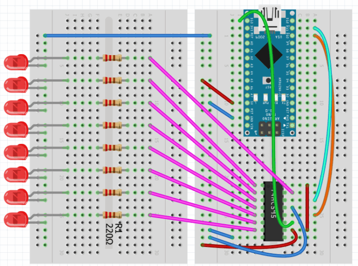 И вот в симуляторе (ссылка на проект) я подключил два сдвиговика к тем же пинам - можно открыть проект и поэкспериментировать. Светодиоды подключены слева направо к выходам 0.. 7. Слева находится сдвиговик, подключенный в цепочку первым: