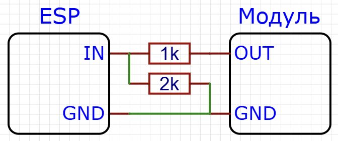 - Если пин передаёт данные на ESP (выход с датчика, TX UART, MISO SPI) - то его желательно подключить через делитель напряжения или конвертер логических уровней. ESP официально не толерантна к 5V, но, судя по отзывам в интернете, всё работает стабильно и не сгорает. По крайней мере, все современные МК защищены от превышения напряжения диодной вилкой, которая находится "внутри" каждого пина