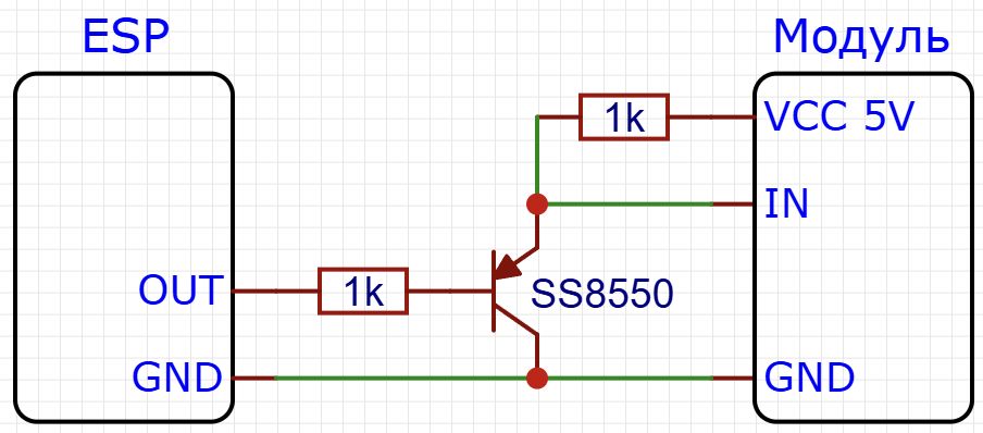 - Если пин принимает данные с ESP (вход датчика, RX UART, MOSI SPI), то нужно смотреть документацию на компонент - будет ли он считать 3.3V за высокий сигнал. Если будет - хорошо. Если нет, то опять же есть варианты: можно использовать конвертер логических уровней (специальный или схему из одного транзистора), либо понизить напряжение питания компонента (если это возможно), чтобы он принимал 3.3V как высокий сигнал. Если компонент слаботочный - его можно подключить через кремниевый диод - он срежет около полувольта