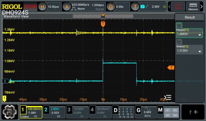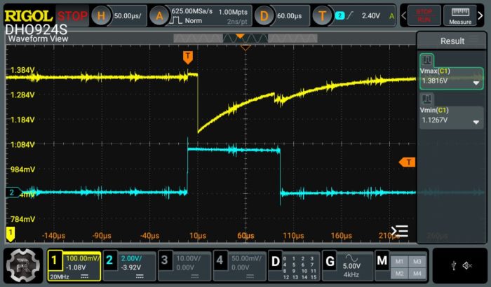 Жёлтый - напряжение с делителя, синий фронт показывает момент чтения АЦП.