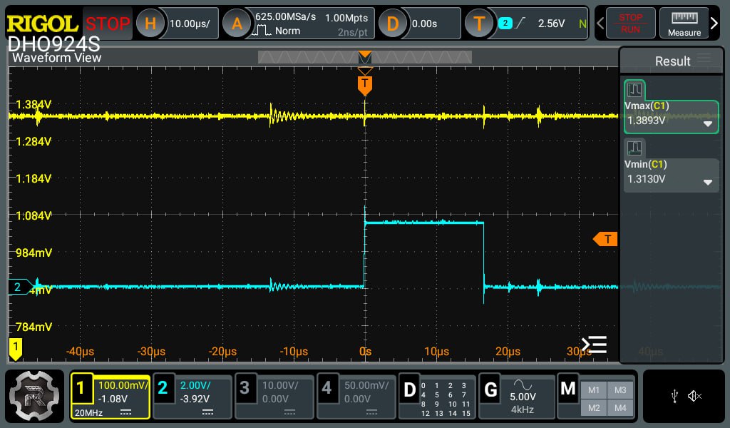 Жёлтый - напряжение с делителя, синий фронт показывает момент чтения АЦП.
