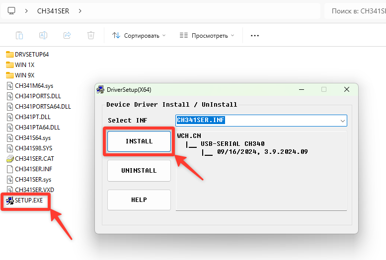 SETUP.EXE, в окне нажатьINSTALL - CH343 - распаковать архив, запустить