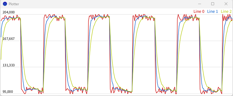 - Постоянный равномерный шум "вокруг" реального значения, такой сигнал выглядит как пилообразная линия. Чаще всего наблюдается в измерениях АЦП или датчиков на основе АЦП при наличии рядом постоянного источника помех или при питании АЦП от шумного импульсного источника питания. Также довольно часто АЦП имеет собственный шум в несколько единиц даже при идеальном питании. Это самый простой шум, его легко отфильтровать почти любым фильтром