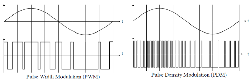 PDM - импульсно-плотностная модуляция (Pulse-Density Modulation). Как и ШИМ, позволяет представить аналоговый сигнал в виде цифровых импульсов. В отличие от ШИМ, имеет фиксированную ширину импульсов, но разный период между ними - сигнал состоит из одиночных импульсов, а среднее значение соответствует плотности этих импульсов на единицу времени. PDM даёт более высокочастотный шум, который проще сгладить фильтром для получения аналогового сигнала, поэтому часто используется для модуляции аналоговых сигналов (ЦАП), в том числе для воспроизведения звука.