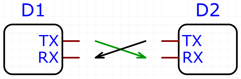 Здесь всё логично - пин отправки одного устройства подключается к пину приёма второго устройства и наоборот, т.е. крест-накрест. Также не забываем соединить GND - сигналы ходят относительно него.