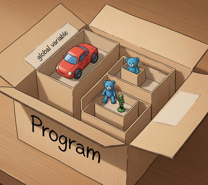 Если проводить аналогии, то блок кода - это коробка, переменная - игрушка, область видимости - пространство внутри коробки с игрушкой. В таком случае программа - это главная самая большая коробка, в которой находятся все остальные коробки (комната). Игрушку видно из коробки, в которой она лежит, а также изо всех коробок внутри этой коробки. Нельзя увидеть игрушку, находясь в соседней коробке. Игрушка, которая лежит в главной коробке, имеет глобальную область видимости, её видно изо всех коробок. Игрушки во вложенных коробках - локальную область видимости: